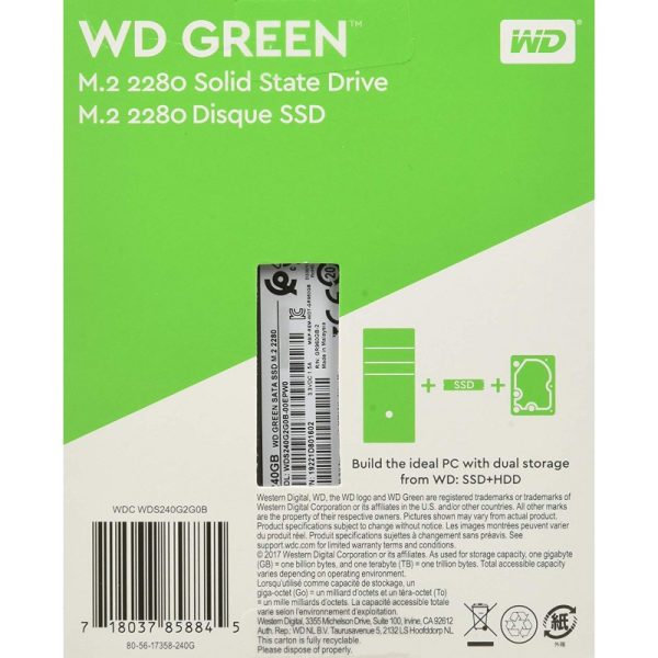 محصول « WDS240G2G0B » شرکت «وسترن دیجیتال» (Western Digital)، نسل دوم حافظه‌ی اینترنال SSD است که یکی از محصولات سری «Green» این شرکت است. این محصول از فرم فاکتور M.2 بهره می‌برد و از طریق رابط SATA 3 با سرعت انتقال ۶ گیگابیت بر ثانیه به مادربرد رایانه متصل می‌شود. رم اس اس دی WDS240G2G0B قادر است با سرعت ۵۴۵ مگابایت بر ثانیه اطلاعات را خوانده و با سرعت ۴۳۵ مگابایت بر ثانیه به نوشتن اطلاعات بپردازد. عمر مفید این محصول بیش از یک میلیون ساعت عنوان شده است که مقدار بسیار مطلوبی است. یکی از مهم‌ترین ویژگی‌های حافظه‌های SSD مقاومت آن‌ها در برابر شوک و لغزش‌ است. این محصول از شرکت وسترن دیجیتال می‌تواند تا ۱۵۰۰G در برابر شوک مقاومت کند و از اطلاعات ارزشمند شما حفاظت کند. از ویژگی‌های محصولات سری گرین شرکت وسترن می‌توان به مصرف بسیار کم برق این محصولات و در عین‌حال بازده خوب اشاره داشت. شرکت وسترن دیجیتال یکی از بزرگ‌ترین شرکت‌های فعال در حوزه تجهیزات ذخیره‌سازی اطلاعات است، که به طراحی و ساخت اقلامی از جمله هارد دیسک، حافظه SSD و ذخیره‌سازهای تحت شبکه می‌پردازد.